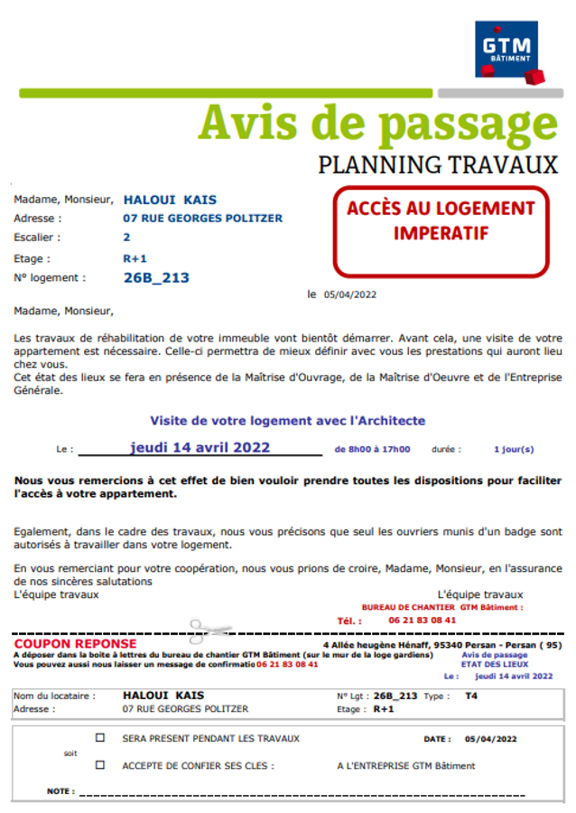 Le maitre d’œuvre, GTM Bâtiment et votre bailleur visitent ensemble votre logement afin de dresser un état des lieux, préciser le détail des prestations qui seront réalisées chez vous et les modalités d’intervention. Vous recevrez, au minimum une semaine à l’avance, un avis de passage par courrier ou par mail avec une proposition de rendez-vous pour la visite avant travaux de votre logement.